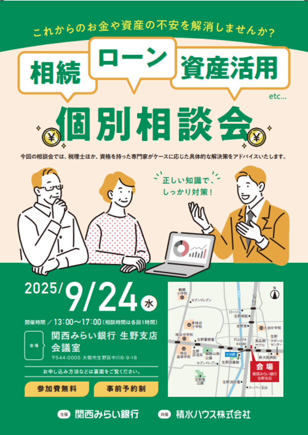2025年9月24日(水) 関西みらい銀行 生野支店において、個別相談会を開催いたします。