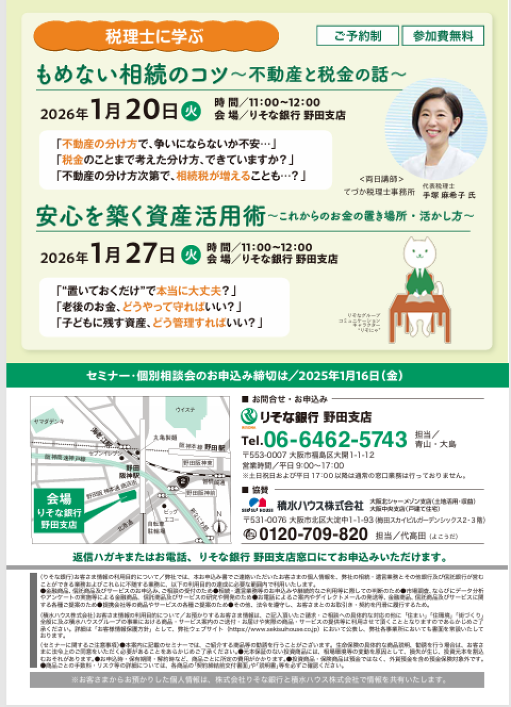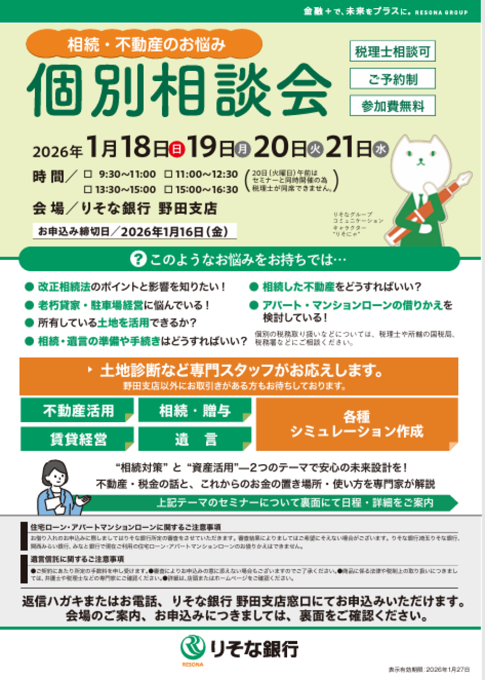 2026年1月18日(日)~21日(水) りそな銀行 野田支店において、個別相談会とセミナーを開催いたします。