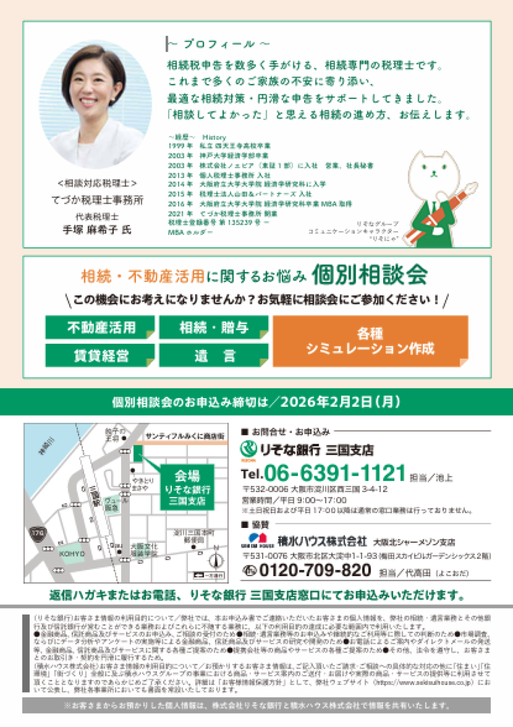 2026年2月5日(木)6日(金) りそな銀行 三国支店において、個別相談会を開催いたします。